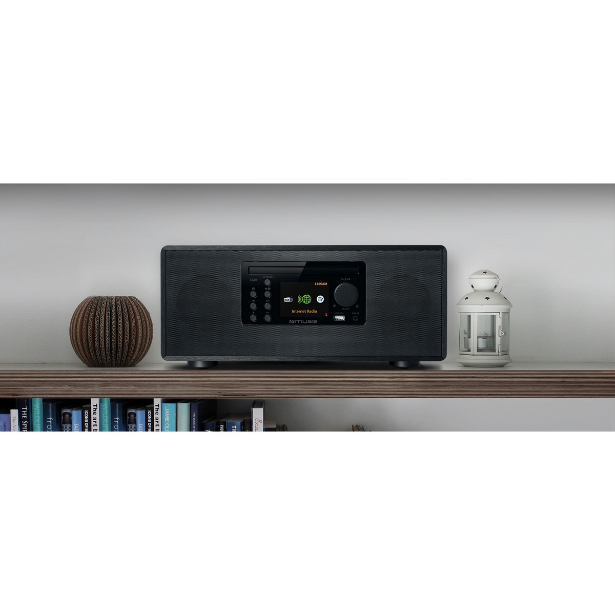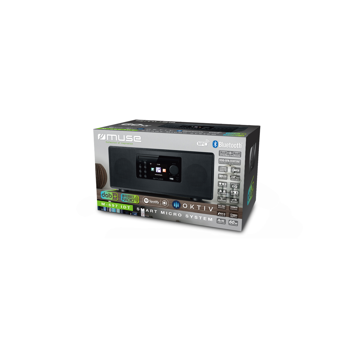 Deze Muse M-697 IDT voorziet u van een prachtig geluid en heeft een mooie en strakke uitstraling met zwart houten kast. Het betreft een echte alleskunner, dit microsysteem speelt namelijk muziek af via internetradio, Spotify, Bluetooth, DAB+ en FM radio, CD en USB. Het apparaat is uitgerust met een multifunctioneel 2,8 inch kleuren TFT display. Het micro systeem beschikt over een passieve subwoofer aan de onderzijde en een totaal vermogen van 60 Watt. De NFC functie zorgt voor automatische koppeling van uw mobiele apparaat met dit micro systeem. Door de wekker en slaaptimer functies is de M-697IDT ook zeer geschikt voor gebruik in de slaapkamer. Of dit alles nog niet genoeg is, beschikt het apparaat ook nog over een USB- en een AUX-aansluiting.