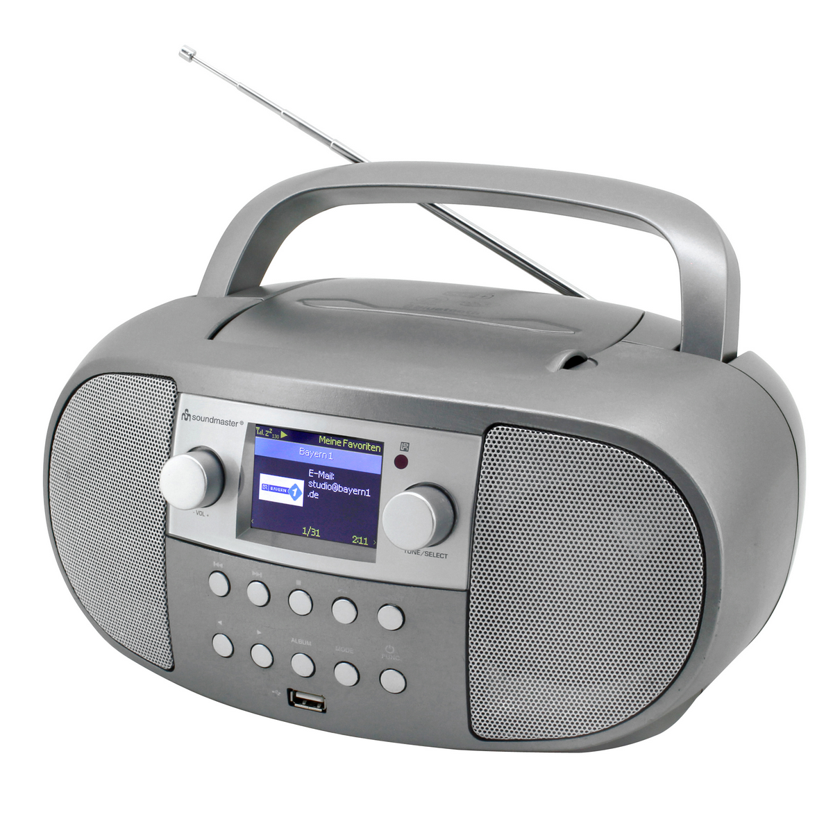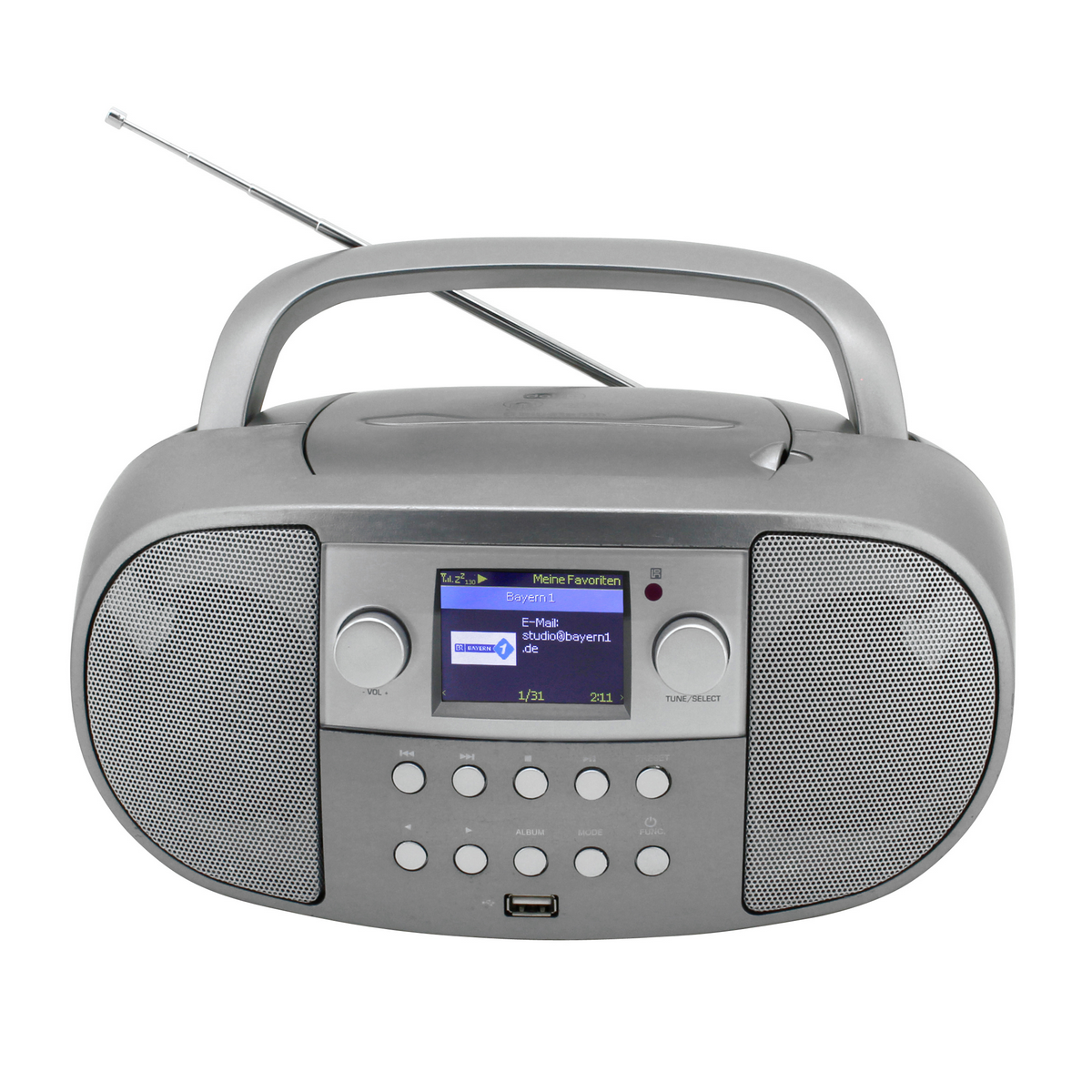 • Internetradio met DAB+, FM en RDS • 150 voorkeuzezenders • CD-speler geschikt voor CD, CD-R/RW, CD-MP3 • USB-aansluiting • Bluetooth • UPnP (Universal Plug & Play) netwerkspeler • Luisterboek-, repeatfunctie • 2.4” kleurendisplay • Klok met dubbel alarm en sleep- en snoozefunctie • AUX-In-aansluiting • Hoofdtelefoonaansluiting • Uitgangsvermogen: 2x 2 Watt (RMS) • Netvoeding: AC 230 V / 50 Hz • Batterij: DC 9 V / 6x LR14/C (niet meegeleverd) • Meegeleverd: afstandsbediening